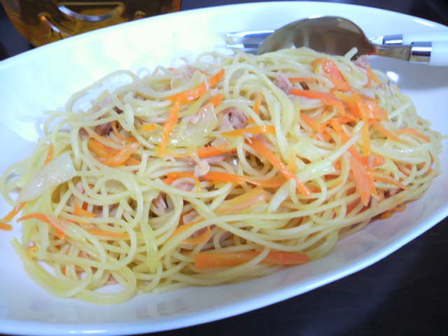 その中に茹でたパスタを投下し、塩胡椒で味付けしながら炒める。